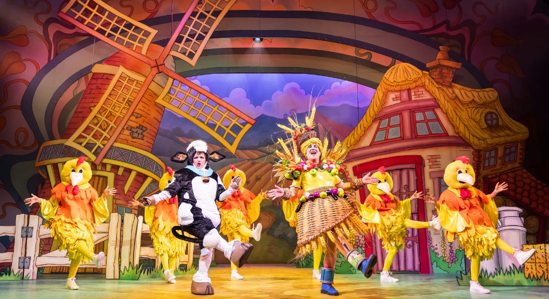 I was a little obsessed with the beautiful set — when the curtain came up and revealed the windmill and farmhouse scene for the first time, I was genuinely wowed by how much artistry had gone into it. The Old Market Square backdrop (where Pat the Cow sadly got exchanged for beans!) was also so fun, with nods to the football teams and even a 360 Degrees (as a nod to one of the cosiest coffee shops in Notts). If that ever gets made into a print, I'll be first in line to get it.